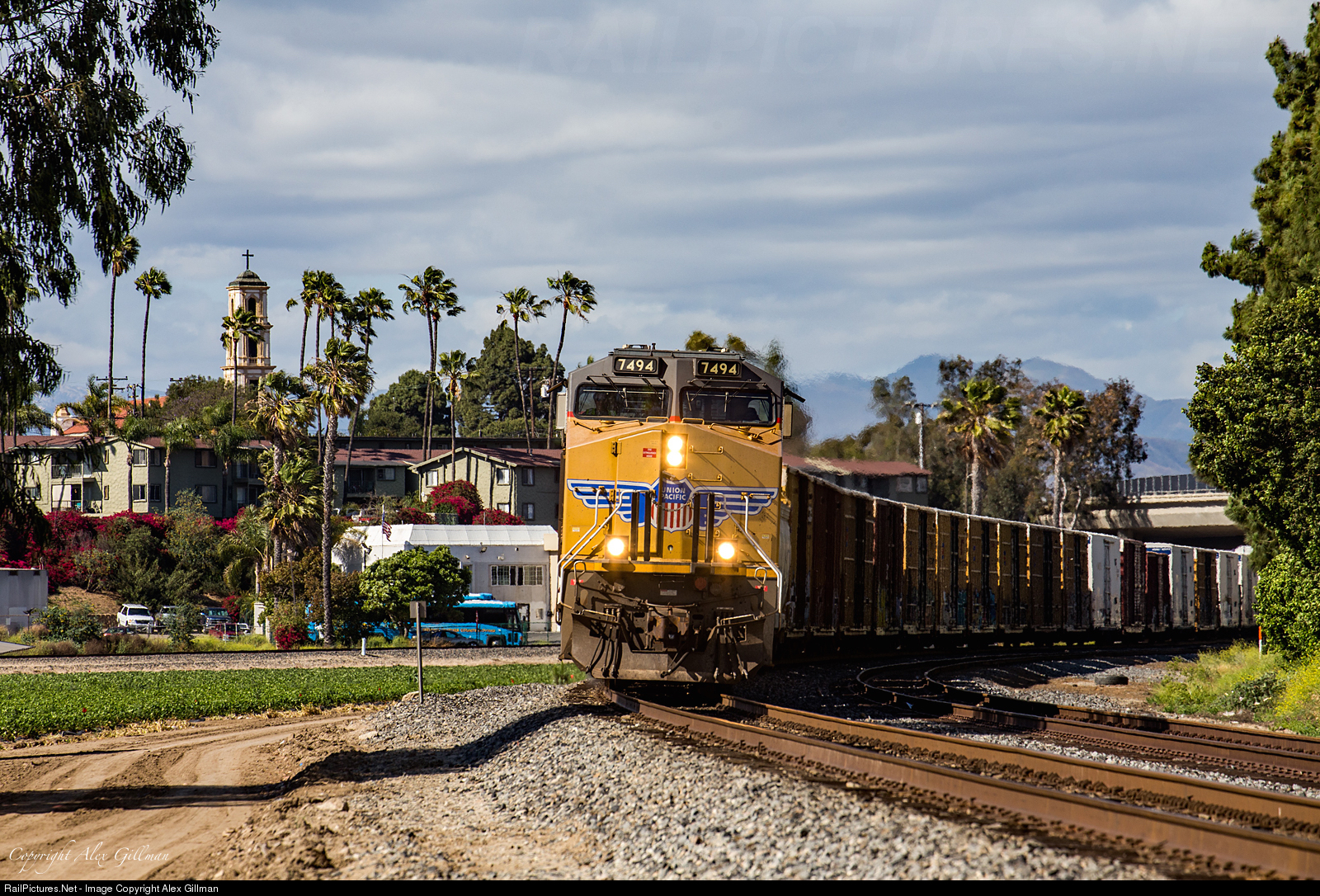 | With the St. Mary Magdalen Chapel and some fitting palm trees providing a "Southern California" backdrop, UP 7494 lugs a hefty LOF67 out of Camarillo as it heads for its first work in Oxnard to set out a number of cars that will be interchanged with the Ventura County Railroad. |