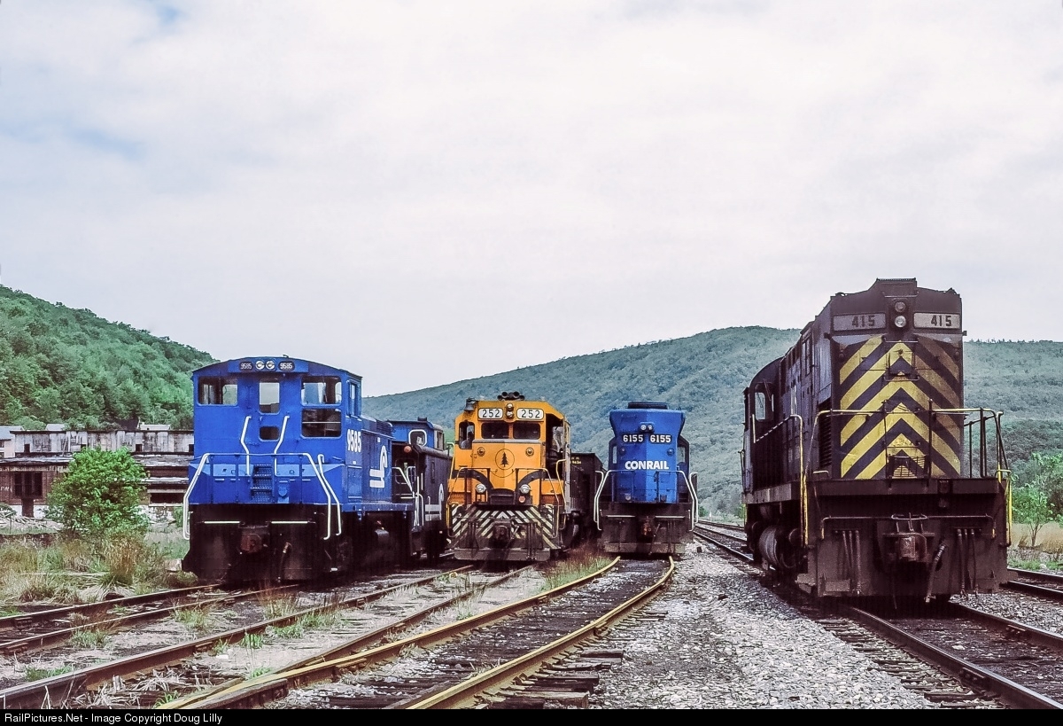 An interesting assortment of power has congregated side-by-side at Lehighton, Pennsylvania. From left to right are a Conrail SW1500, a Maine Central GP38, a Conrail SD45, and a Delaware & Hudson C420. The SW1500 is most likely to be assigned to the former CNJ Nesquehoning Valley branch, and it wasn’t unusual for a Conrail road unit to be set off in Lehighton. I’m unsure of the circumstances around the presence of the D&H and MEC units, but there is a crew in the 252. The LV roundhouse is still standing in this June, 1984 view.