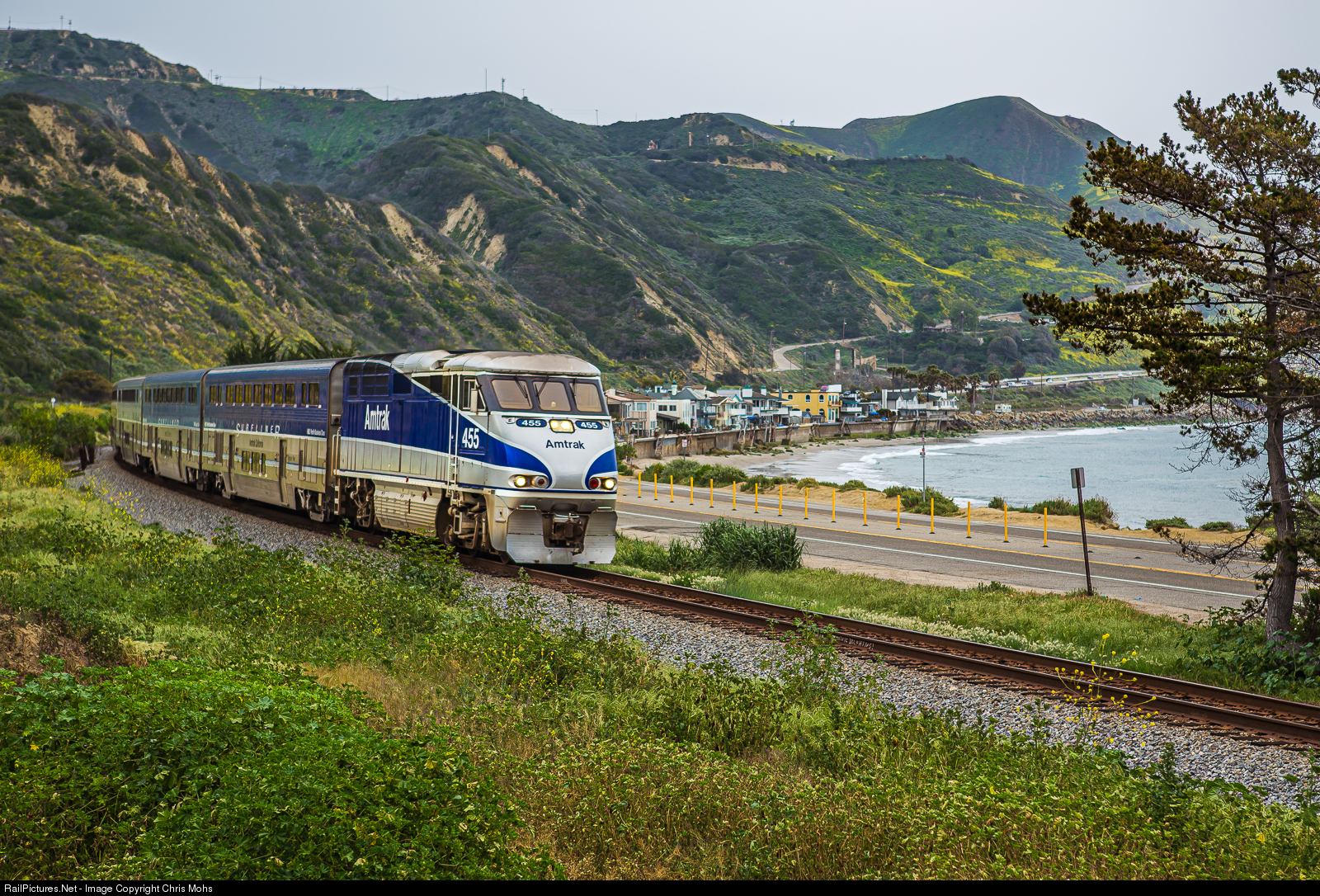 | Northbound Amtrak Pacific Surfliner No. Triple 7 led by F59PHI No. 455 rounds around the bottom Of Faria Beach on a overcast evening. It had been a wet Winter and the coast has turned green as Spring approaches. |