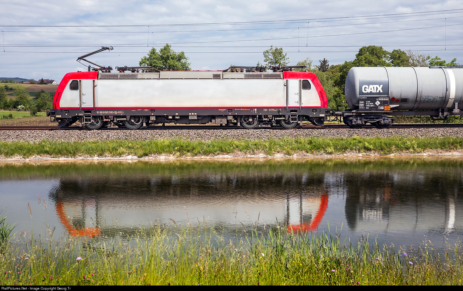 | Bombardier TRAXX F140 AC2 185 # 593 of the Beacon Rail Leasing Ltd., London (BRLL), built in 2008 and rented to the austrian LTE (Logistik und Transport Gmbh, Graz), is pulling the loaded gasolin train 69637 for the Eisenbahndienstleister Gmbh (EDG) from Buchs (SG) via St.Margrethen-Romanshorn VL to Winterthur freight yard (then to Schwarzenbach) along the pond at Riedt near Erlen. |