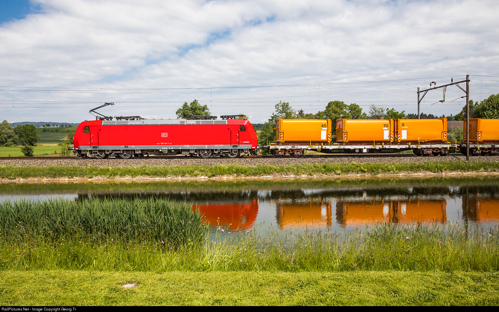 | This is freight train 47057 of the BLS Cargo, but with the locomotive 185 # 123 of the Deutsche Bahn, running along the pond at Riedt near Erlen. The train is transporting garbage in containers from Singen (Hohentwiel) via Konstanz-Kreuzlingen-Romanshorn VL to the refuse incineration plant of Weinfelden (branch track between Bürglen and Weinfelden) |