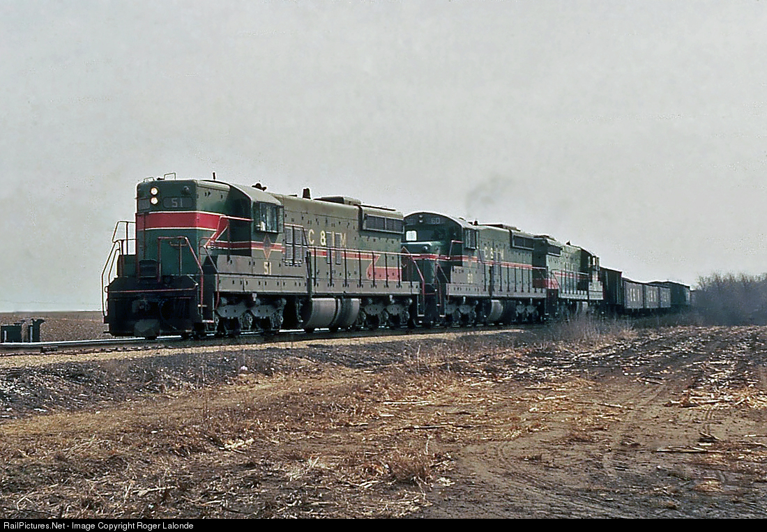 | C&IM SD9 #51, SD18 #60 and SD9 #53 near Atterberry, Illinois in March 1974. No photographer listed on slide. |