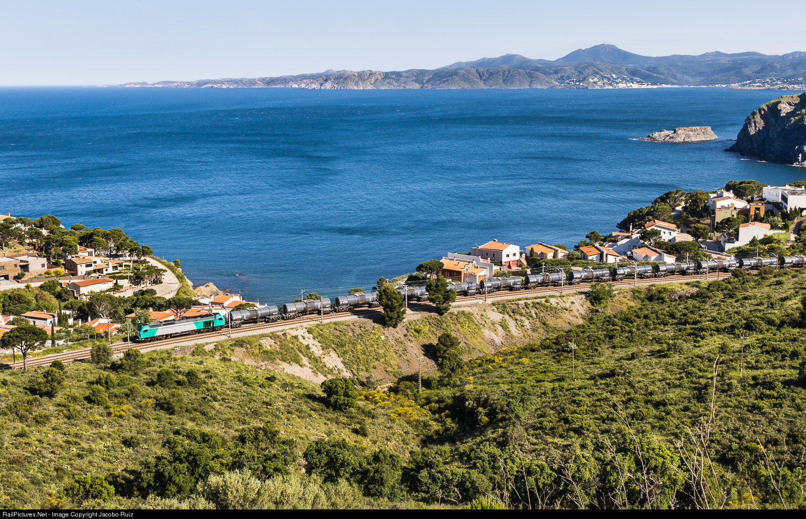 This train is transporting chemical products between the Spanish petrochemical facilities of Tarragona and Germany. In the French town of Cerbère, about 3 km forward the photo site, axes will be changed from the Iberian gauge to the standard gauge.