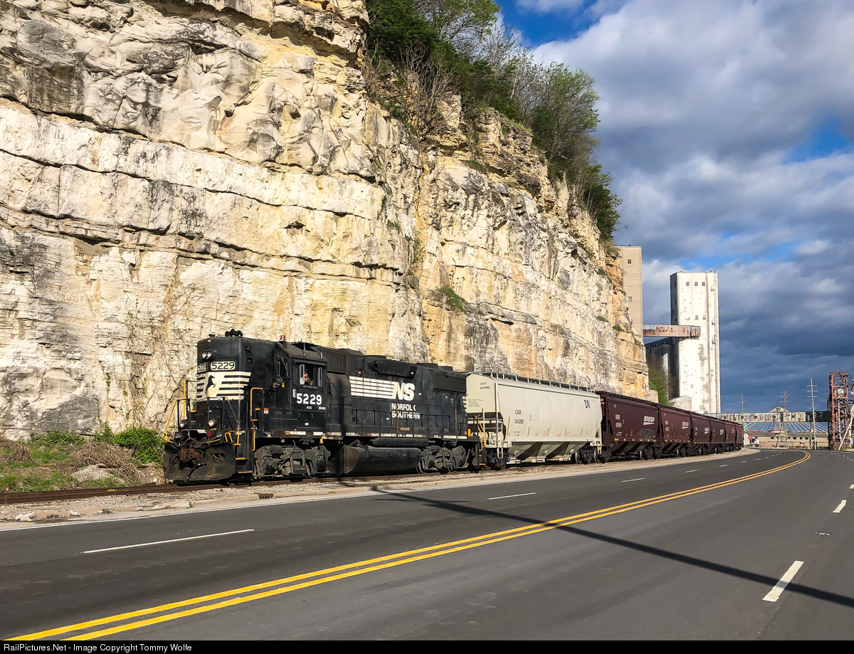 | NS local out of Federal Yard DF25 is seen working the Ardent Mills complex in Alton Illinois with a classy looking ex Southern high hood GP38-2 doing the honors. The Mississippi River Bluffs provide the back drop, and behind me is the swollen Mississippi River.