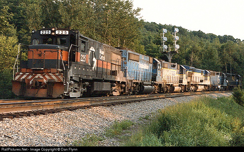 | Six units from MEC, B&M, D&H, and P&LE lead a D&H train over Belden Hill. |