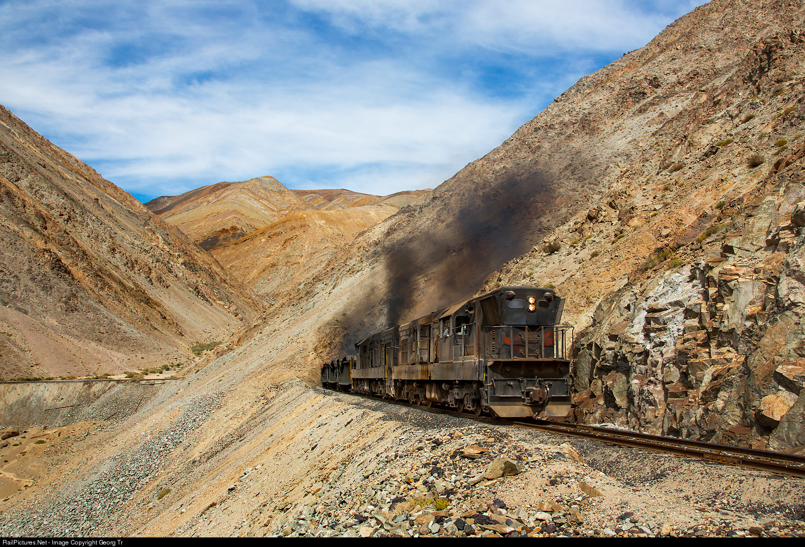 The EMD GR12U # 93 and # 412 of the Ferronor (Empresa de Transporte Ferroviario S.A.), built in 1965/1962, are leaving tunnel # 2 on the 1 meter gauge railway line of the Codelco, pulling a mixed copper concentrates and sulfuric acid tank cars train from Llanta up to Potrerillos, shortly above Montandon. Sadly, this spectacular railway was destroyed in 2015 by heavy floods and was never reconstructed.
