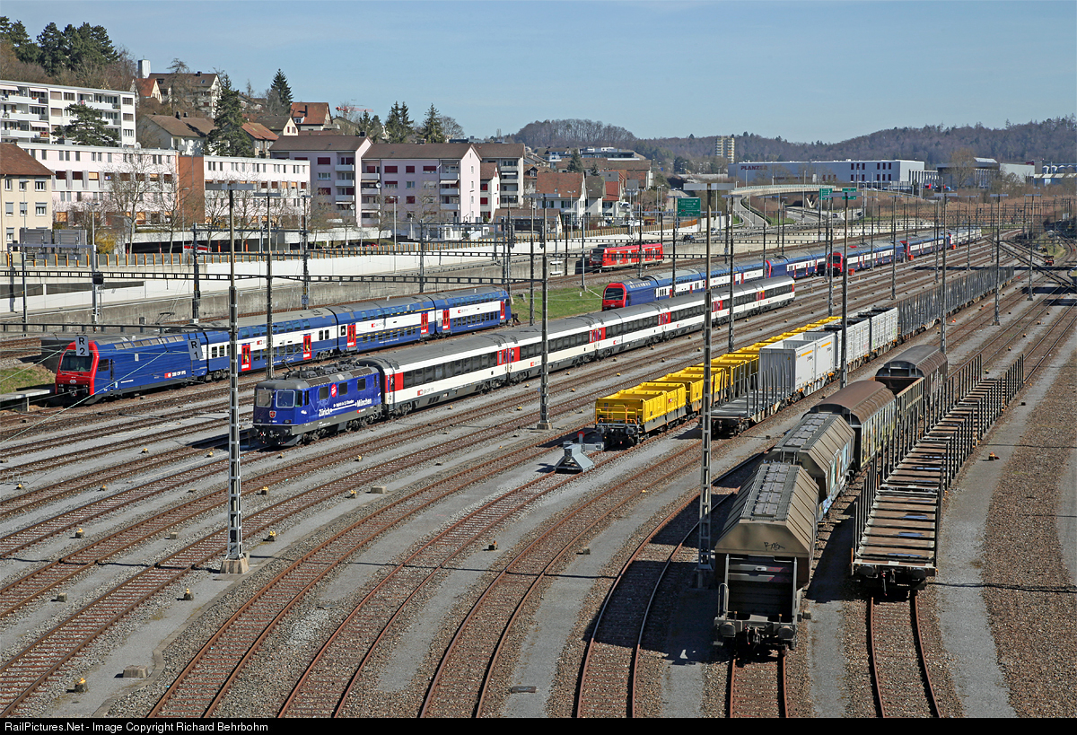 | Sunday rest for SBB passenger trains in Schaffhausen: Re 421 392 with an Intercity train line 4 Schaffhausen – Zurich, eight double deck commuter trainsets (DPZ) of the S-Bahn Zürich and one Siemens double decker DPZ. The red ET 426 is a local train Singen – Schaffhausen of DB (German Railway). |