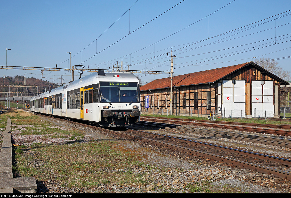| RABe 526 682 and 526 683 and cab car Bt 29 35 222 are in a S29 service Winterthur - Stein am Rhein. These trainsets were constructed in 1998/1999 by Stadler for the Mittelthurgau-Bahn (MThB). The building on the right is a former locomotive shed. Today you can find in it rolling stock of association "SEHR", used on the heritage railway Etzwilen – Singen. |