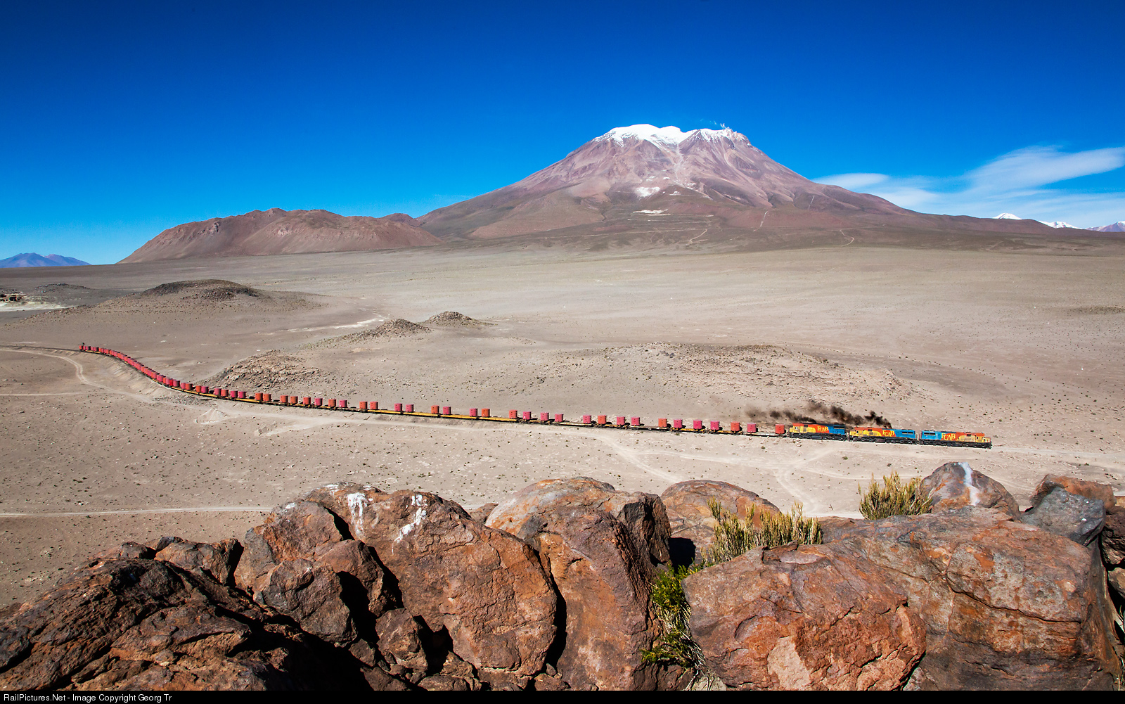 The long train with 40 cars and 80 round specialized containers for lead/zinc/silver concentrates from the San Cristobal mine in Bolivia to the port of Mejillones in Chile left the border station Ollagüe shortly. Distance from the mine to the port is 650 kilometers, trainload about 2320 tons. Pulling are Clyde built GL26C-2 # 2005 and # 2010 from 1971 ex QR (Queensland Railway) and GT22CU-3 # 2402 built in 1963 (former FNC Ferrocarriles Nacionales de Colombia # 410, former STF Sociedad de Transportes Ferroviarios # 1210). The active stratovolcano Ollagüe is 5868 meters (19,252 ft) high and shows fumarolic activity. The photo position is about 3750 meter a.s.l.