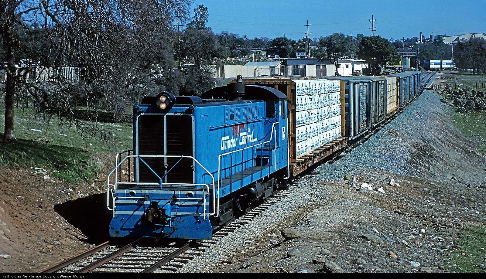 A train of loads from the Georgia Pacific mill departs Martell for the Southern Pacific interchange at Ione.