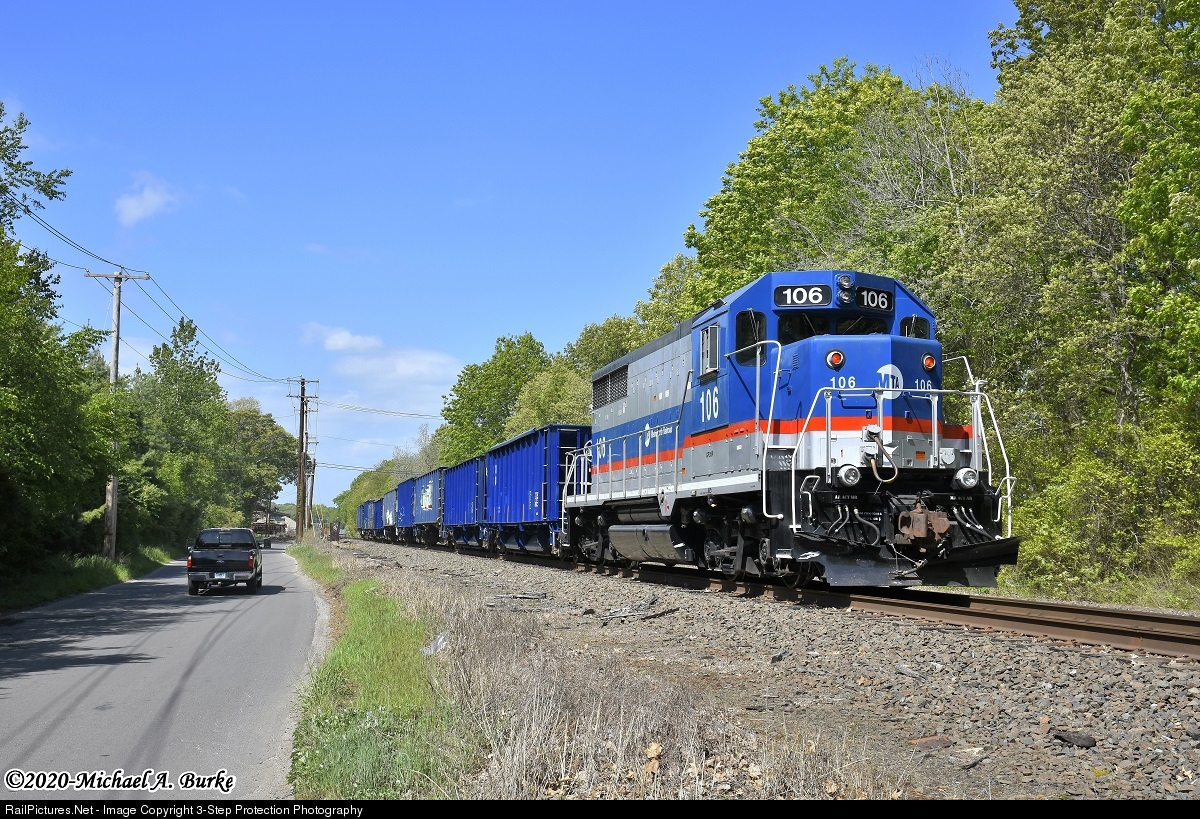 | A Metro-North work extra parallels Oronoque Rd. in Milford after dropping new ballast between Ansonia and Seymour. Since early April, the Waterbury Branch has been shutdown for ongoing track work and the installation of PTC (Positive Train Control).