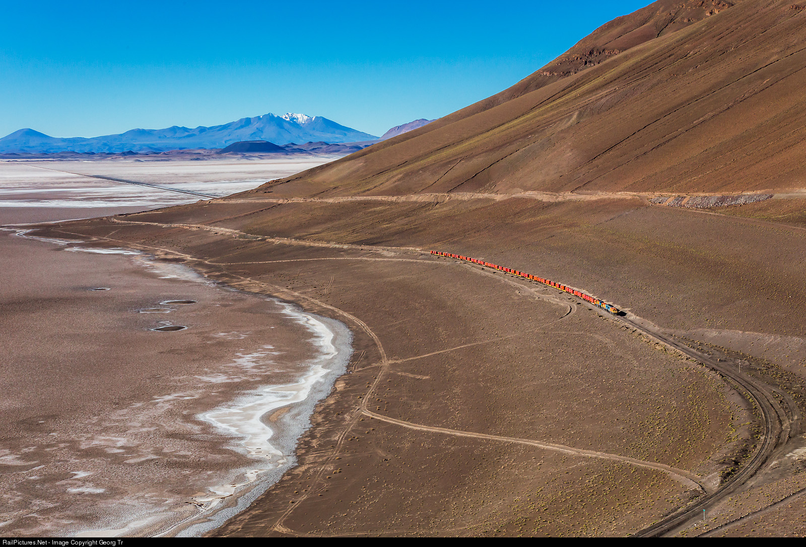 The long train with 40 cars and 80 round specialized containers for lead/zinc/silver concentrates from the San Cristobal mine in Bolivia to the port of Mejillones in Chile left the border station Ollagüe about one hour ago. The train crossed the Salar de Carcote on a dam and is now on the ascent to the passage towards the Salar de Ascotan. Distance from the mine to the port is 650 kilometers, trainload about 2320 tons. Pulling are Clyde built GL26C-2 # 2005 and # 2010 from 1971 ex QR (Queensland Railway) and GT22CU-3 # 2402 built in 1963 (former FNC Ferrocarriles Nacionales de Colombia # 410, former STF Sociedad de Transportes Ferroviarios # 1210).