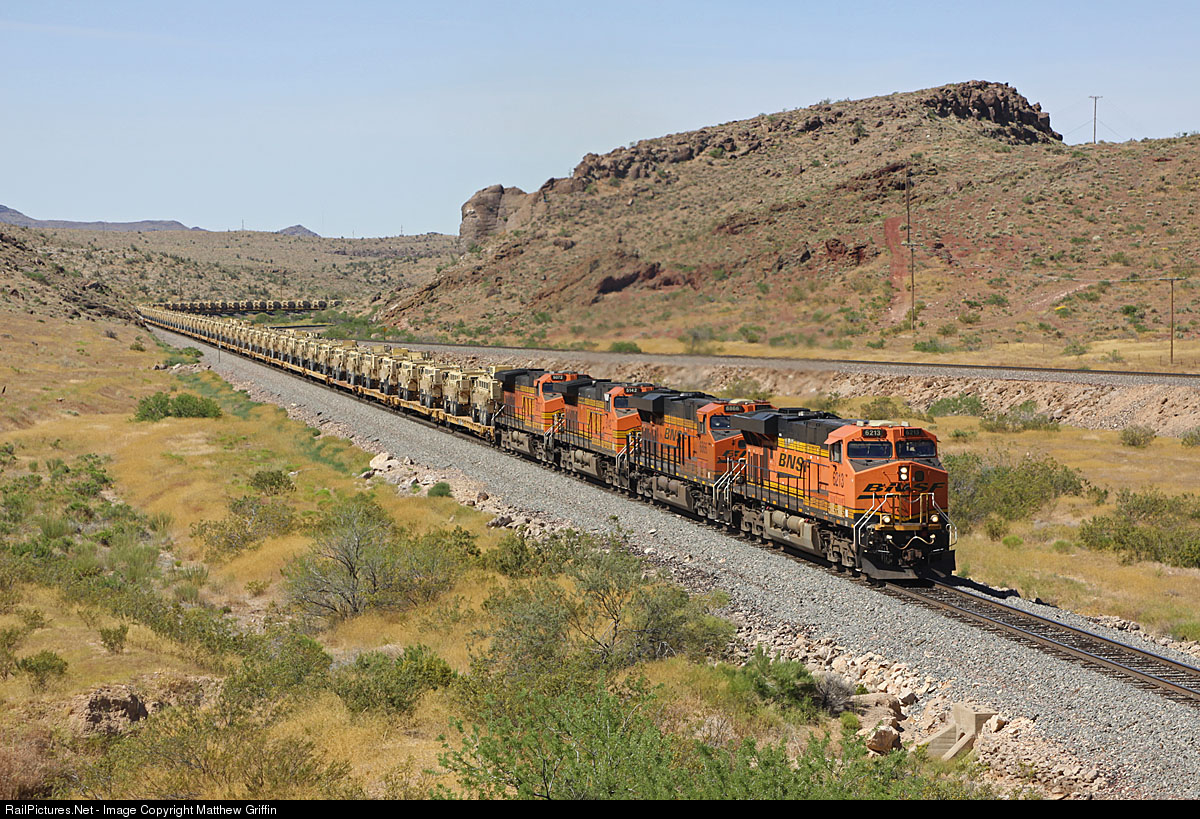 BNSF 6213 leads an eastbound military train bound for Ft. Bliss, TX, as it exits Slaughter House Canyon in downtown Kingman.