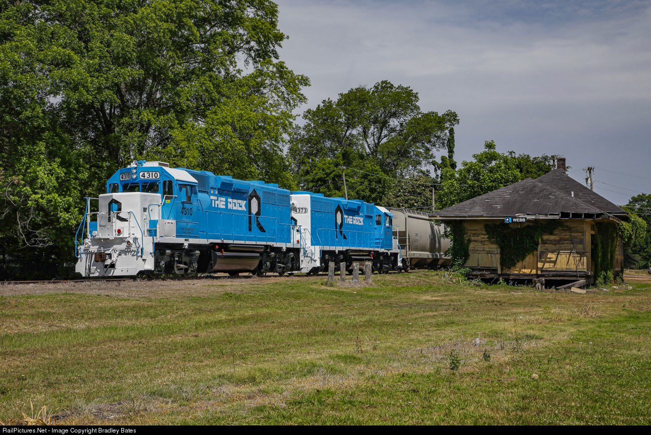 The pair of newly painted Rock Island GP38’s #4310 and #4373 pulls a cut of covered hoppers passed the train depot in Webb, MS, as they head south towards Swan Lake, MS.