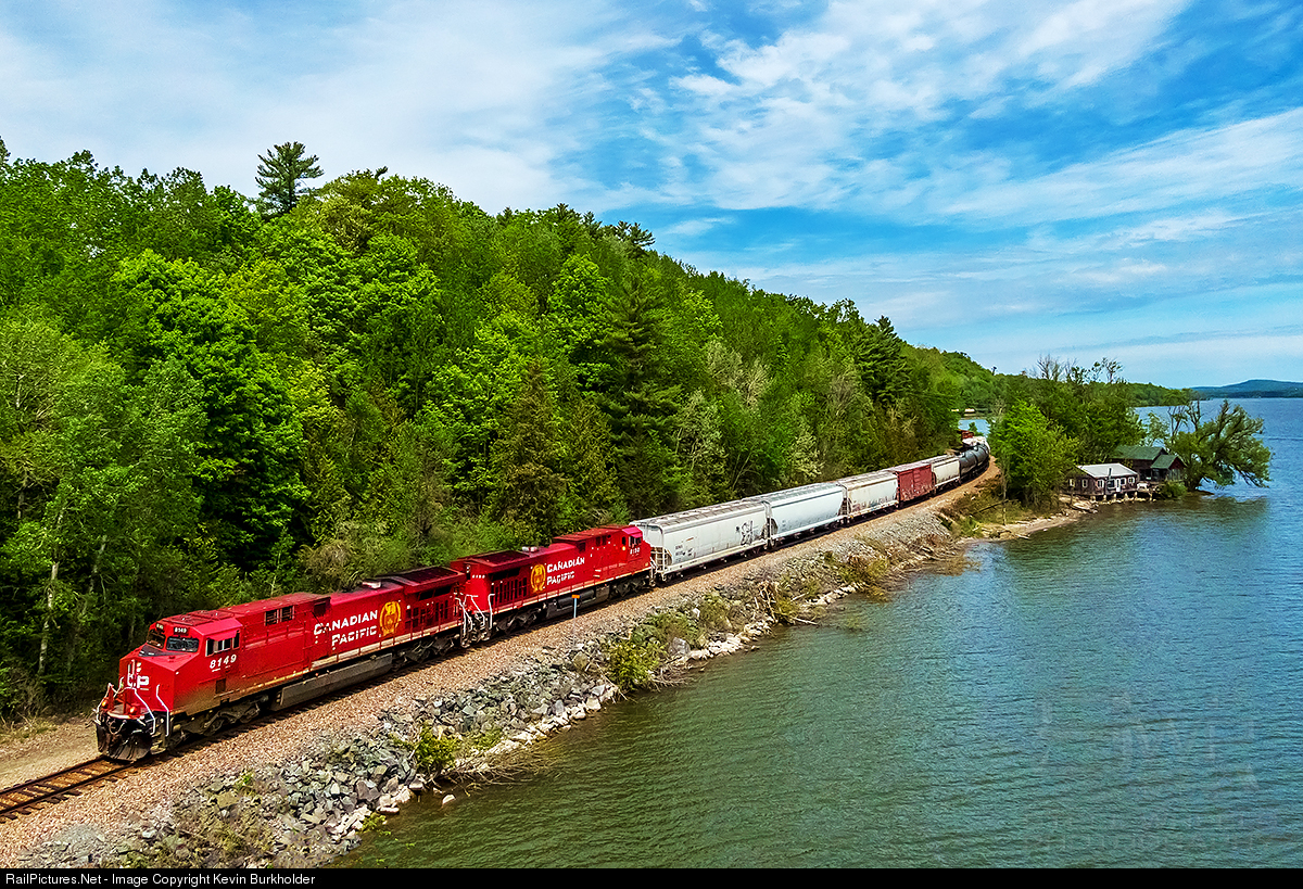 Canadian Pacific Railway's Montreal, QC to Saratoga Springs, NY train 252-24 is seen rolling along Lake Champlain at Putnam Station, NY, with consecutively numbered AC4400CWM rebuilds, CP 8149 and 8150. The train departed Montreal with 180 cars, 151 loads, 29 empties, 20,380 tons and nearly 11,000 ft with DPU 8917 at roughly 120 cars deep in train.