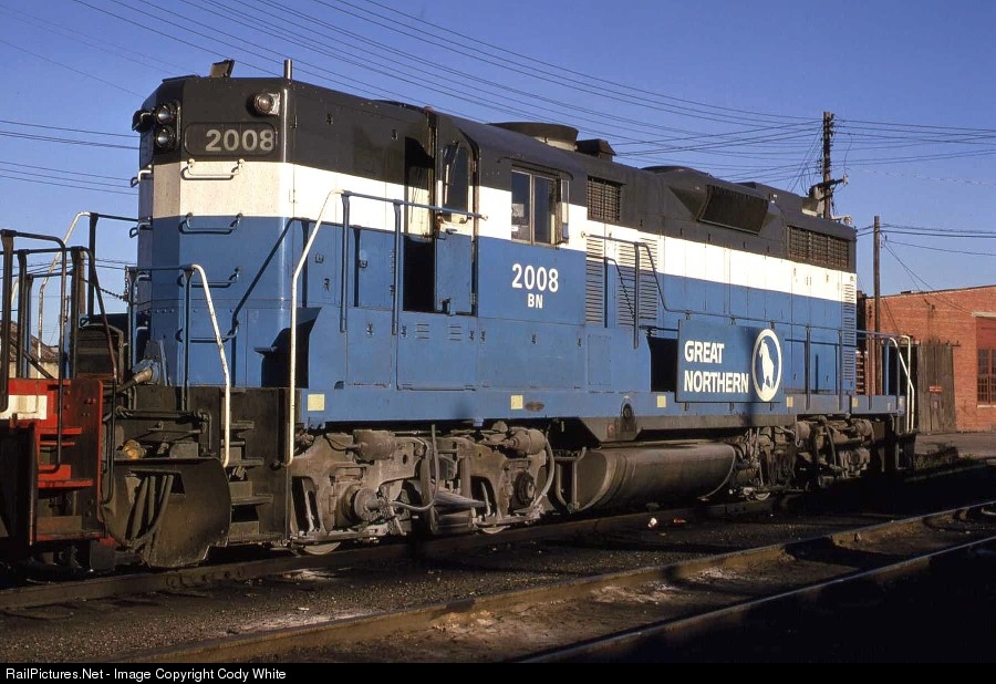 Burlington Northern GP20 2008 resting at the Grand Forks roundhouse October 1970. The 2008 was built in April 1960 as GN 2008 and was eventually sold to Zeigler Cat and rebuilt into a GP20C. The GP20s were the last high short hood, long hood forward and original orange and green units built for the Great Northern. Unknown Photographer Photo from my Collection.
