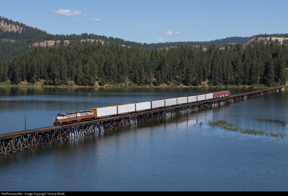 | A pair of St. Maries Railroad GP9s trundle across the long wooden trestle crossing Benewah Lake near Parkline Idaho. The 12 loads of wood products are bound for interchange with the Union Pacific in Plummer Idaho. STMA GP9s 101 and 103 were built between April and June of of 1959 as Milwaukee Road 292 and 322. Some 60 years after being built these GP9s are still working their original home rail. The St. Maries railroad operates on one of the last stretches of the Milwaukee Road's Pacific Coast Extension west of Eastern Montana. |