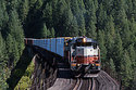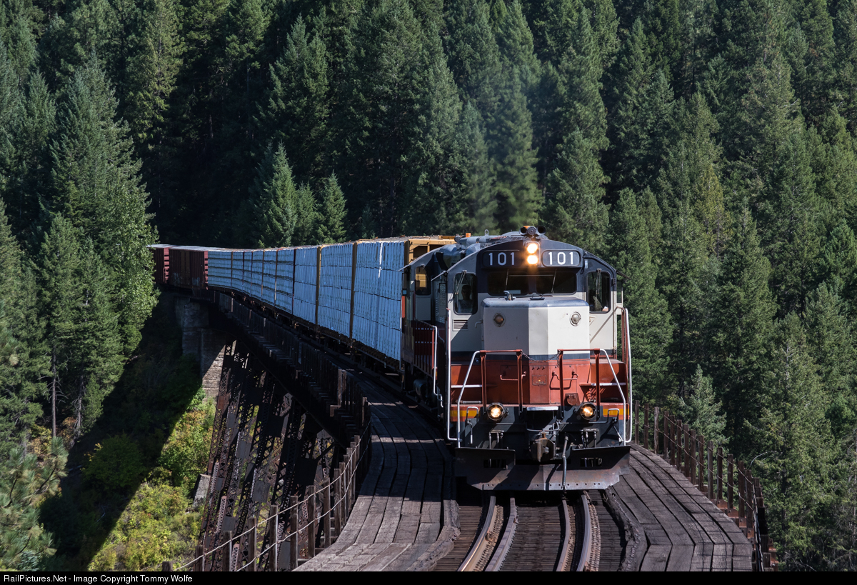 The calm of the Idaho pine forests are momentaily distrubed by the St. Maries River Railroad's Plummer turn. The train is lead by a pair of the railroads GP9s as they trundle across the massive Pedee Idaho Trestle with 12 cars enroute to Plummer Idaho and the interchange with the UP. The St. Maries Railver Railroad serves a couple of the lumber mills on the south side of Lake Couer d'Alene in and around St. Maries.