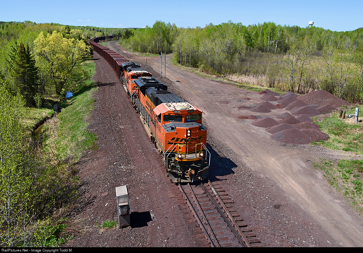 | Descending from the USS Minntac plant with 130 loads of pellets the CN crew is heading for CN Keenan yard with this BNSF all-rail train that is going to a final destination at Granite City Works blast furnace. |