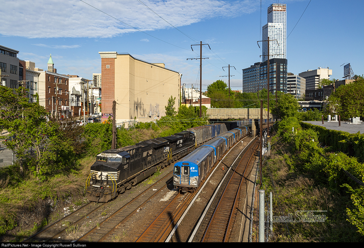 A Path train zips by the PN-13 running around an inbound trash train for New Jersey Rail Carriers on a clear spring afternoon in Jersey City. This small section of track is all that remains of the busy PRR main that was once shared by freight, passenger, and the Hudson and Manhattan.