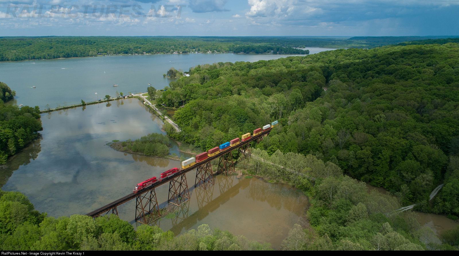 Indiana Railroad train SAHW crosses the 970ft long Shuffle Creek Trestle on edge of Lake Lemon with a pair of SD40-2s doing the honors on Memorial Day in 2020.