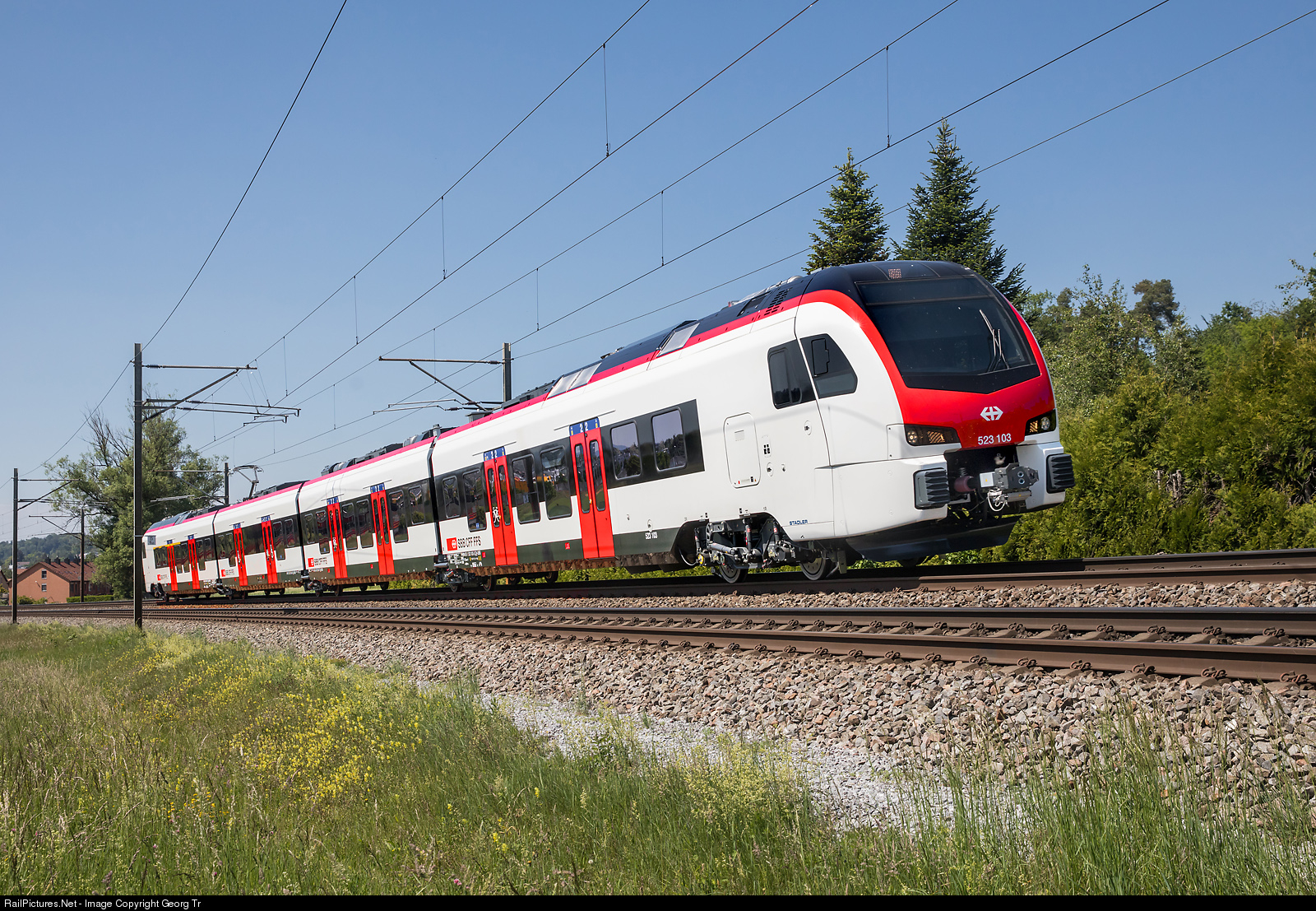 | Brand new "Flirt 3" RABe 523 # 103 from StadlerRail for the SBB is returning from test runs back to Erlen, running as 32253 from Solothurn via Olten-Winterthur, between Bassersdorf and Effretikon. The SBB ordered 14 of this trains as reinforcement for the S-Bahn system "Vaud" around Lausanne. |
