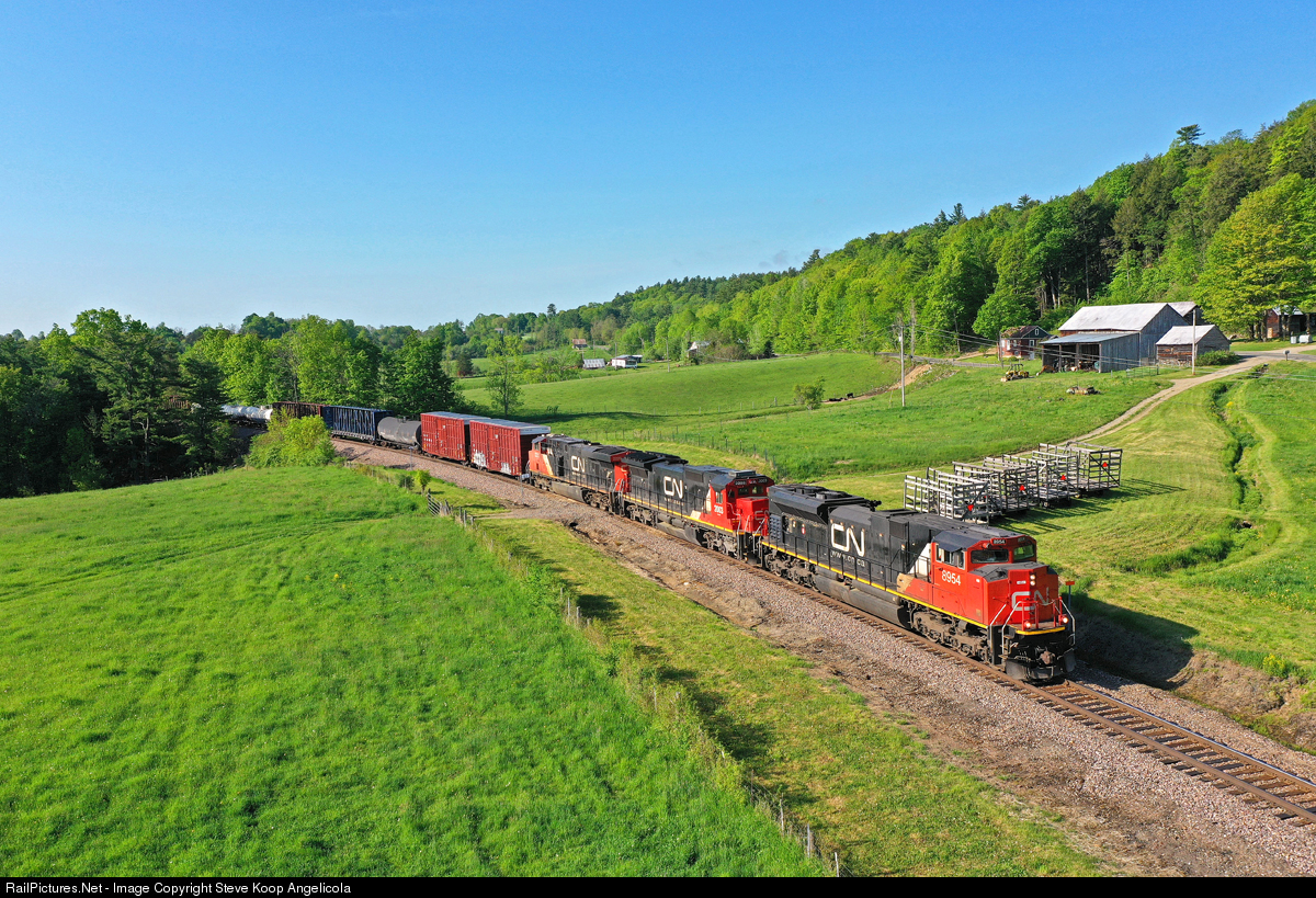 | Early morning CP/NS train 931 approaches the south end of Howard's siding in Westport with a nice all CN lashup, CN 8954, CN 2003, CN 2225. |