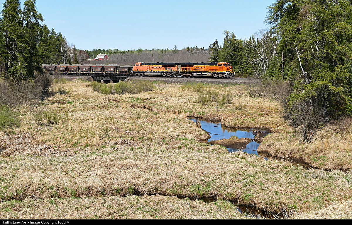 A CN crude ore train using two BNSF horsepower payback units pulls 118 cars south towards the Fairlane plant on a nice spring afternoon.