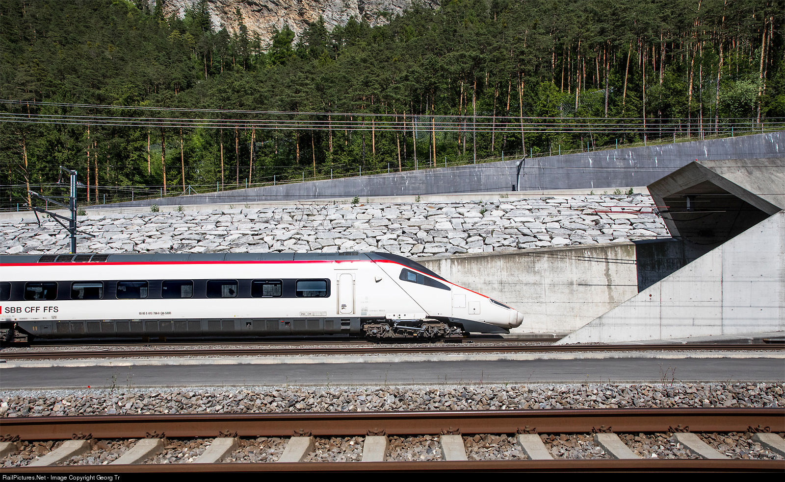 | Highspeed tilting train ETR 610 # 006 of the SBB is entering the 57 kilometer long Gotthard Base Tunnel (GBT) at 160 km/h, running the Eurocity 321 from Zürich to Chiasso only (the border to Italy is still closed because of Covid-19). |