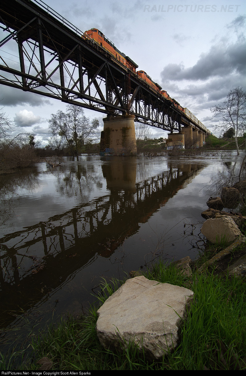 On a wet, muggy winter afternoon, an east bound BNSF intermodal rocks and shakes the cables of the old bridge across the San Joaquin River in north Fresno. The river is overflowing, due too an extensive amount of rain and snow that hit the Sierras Nevada’s in the early months of 2017, resulting in massive flooding throughout the foothills.