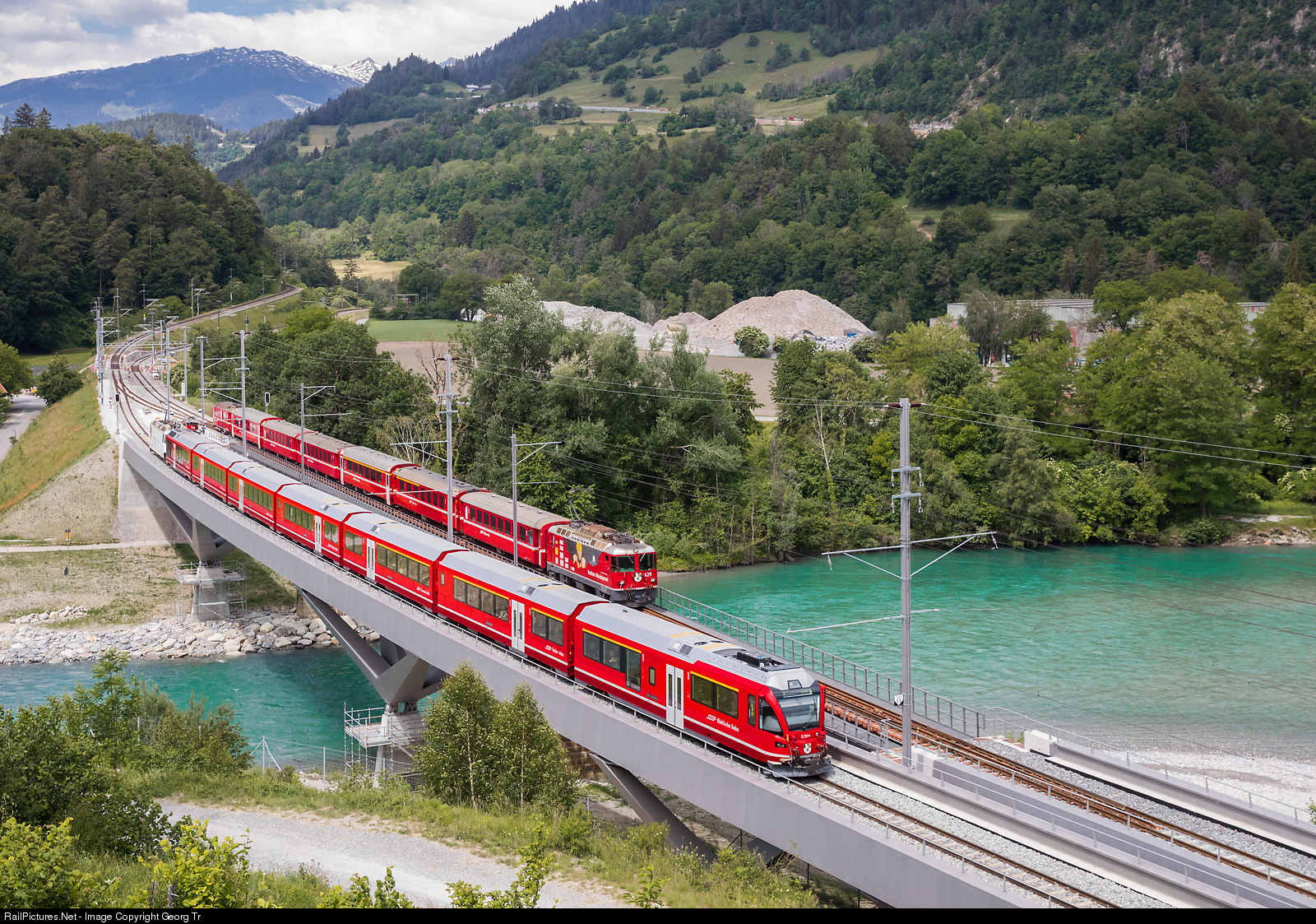 Since both parallel bridges over the Hinterrhein at Reichenau-Tamins are finished, sometimes it can be observed a parallel run of the trains from Disentis and Thusis, entering Reichenau-Tamins. Crossing the new about 200 meter long steel/concrete bridge "Sora Giuvna" (younger sister in the romansh language) is the Interregio 1132 from St.Moritz over the Albula line, with leading cab car At, the permanently coupled ALVRA trainset and Ge 4/4 III # 642 in the white "Integral" paint scheme in the rear. Crossing the old, but renovated and reinforced truss bridge from 1895 is the Regio Express 1732 from Disentis-Mustér to Chur-Landquart, further as RE 1041 to Klosters-Davos Platz (covid-19 timetable), pulled by locomotive Ge 4/4 II # 629 in the special paint scheme for the construction works of the new Albula tunnel II. The Hinterrhein river, coming from the left, conflluence with the Vorderrhein from the Oberalppass region just on the right of the picture.