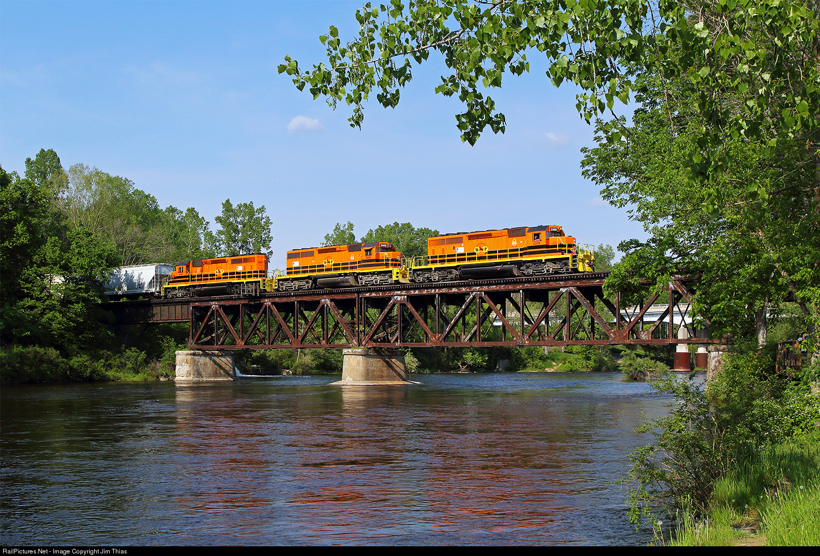 | Marquette Rail’s Z151 cruises over the Muskegon River in Newaygo, led by 3389, 3406, and 3390. |