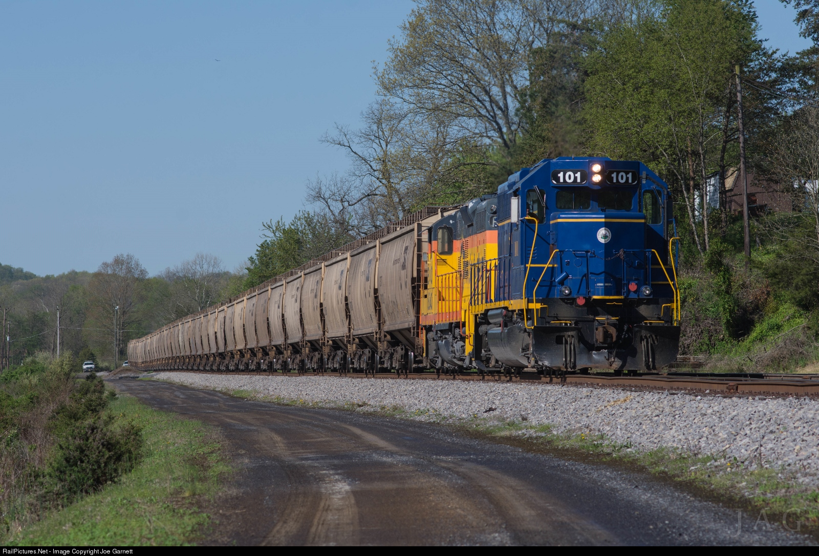 It's a beautiful May morning in the West Virginia mountains, and the daily South Branch Valley crew is almost done prepping the days run. CSX had just delivered a grain train over the weekend, and the first half of the grain was to be delivered on this particular day. With 47 loads of chicken feed, a trio of blue and yellow SBVR units were on the south end, while seen here, the two rear pusher motors were GP38-3 #101, and Ex B&O GP9 #6240, adorned in a Chessie System scheme.