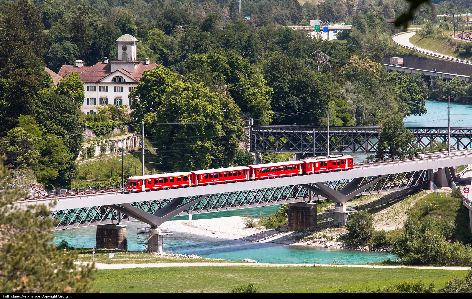 "Stammnetzpendel" (push-pull train for the main network) with railcar Be 4/4 # 515, built in 1979, second class cars B # 2414 and # 2418 and cab car ABDt # 1715, running the S 1 service 1514 from Rhäzüns via Chur-Landquart to Schiers, is crossing the 200 meter long new "Sora Giuvna" (younger sister in romansh language) bridge over the Hinterrhein at Reichenau-Tamins. Behind is the old, but renovated truss bridge dating from 1896. Below (or behind) the bridges is the confluence of the Vorderrhein (coming not visible from the left) and the Hinterrhein, coming from the right. In the background the castle Reichenau from the 18th century and the old road truss bridge over the Rhine.