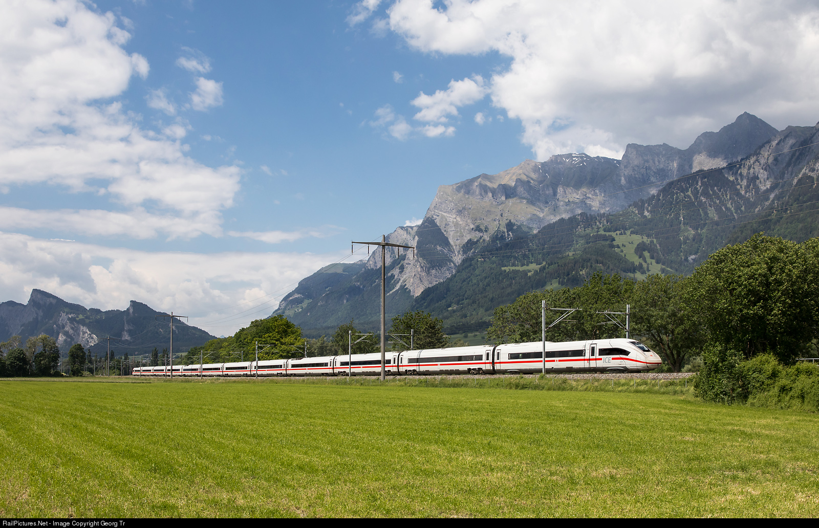 Since a few days only, the passenger rail traffic between Germany and Switzerland started again after the "Corona shut-down". The 12-car highspeed train of type "ICE 4" series 412/812 # 9016 of the Deutsche Bahn (DB) is running the ICE 71 from Hamburg Altona via Frankfurt-Mannheim-Basel-Zürich to Chur, between Maienfeld and Landquart. This ICE 4 trains for 250 km/h maximum velocity are running on this line since timetable change in december 2019. Before, there were trains of the ICE 1 series. In the background from left to right Fläscherberg, Falknis (2562 meter), Schwarzhorn and Glegghorn.