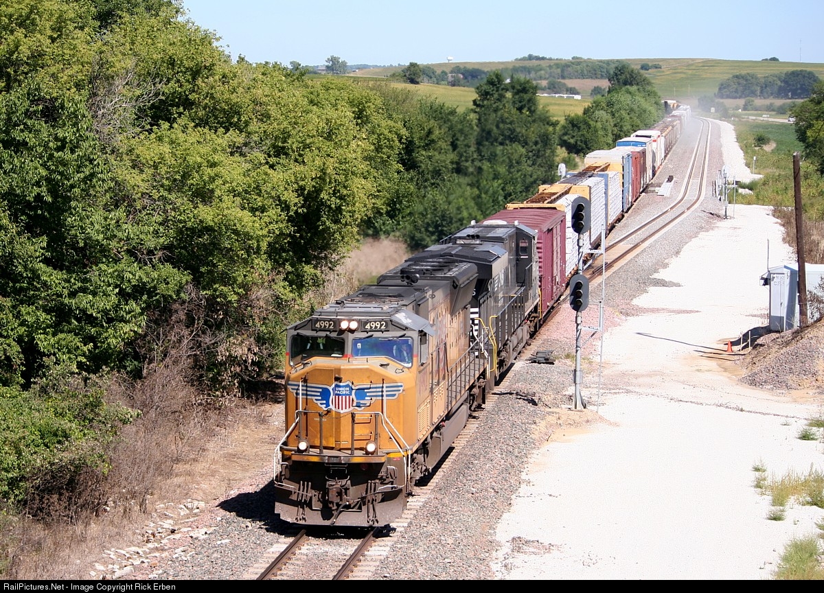 A westbound moves onto single track at the west end of Kennard, NE, between Blair and Fremont. This former C&NW line was a single track bypass around Council Bluffs/Omaha and following the mid-90s merger UP began adding a second main with hopes of avoiding slow running through the terminal area. Kennard is as far as the project got, because business slumped and the route has gotten awfully quiet these days.