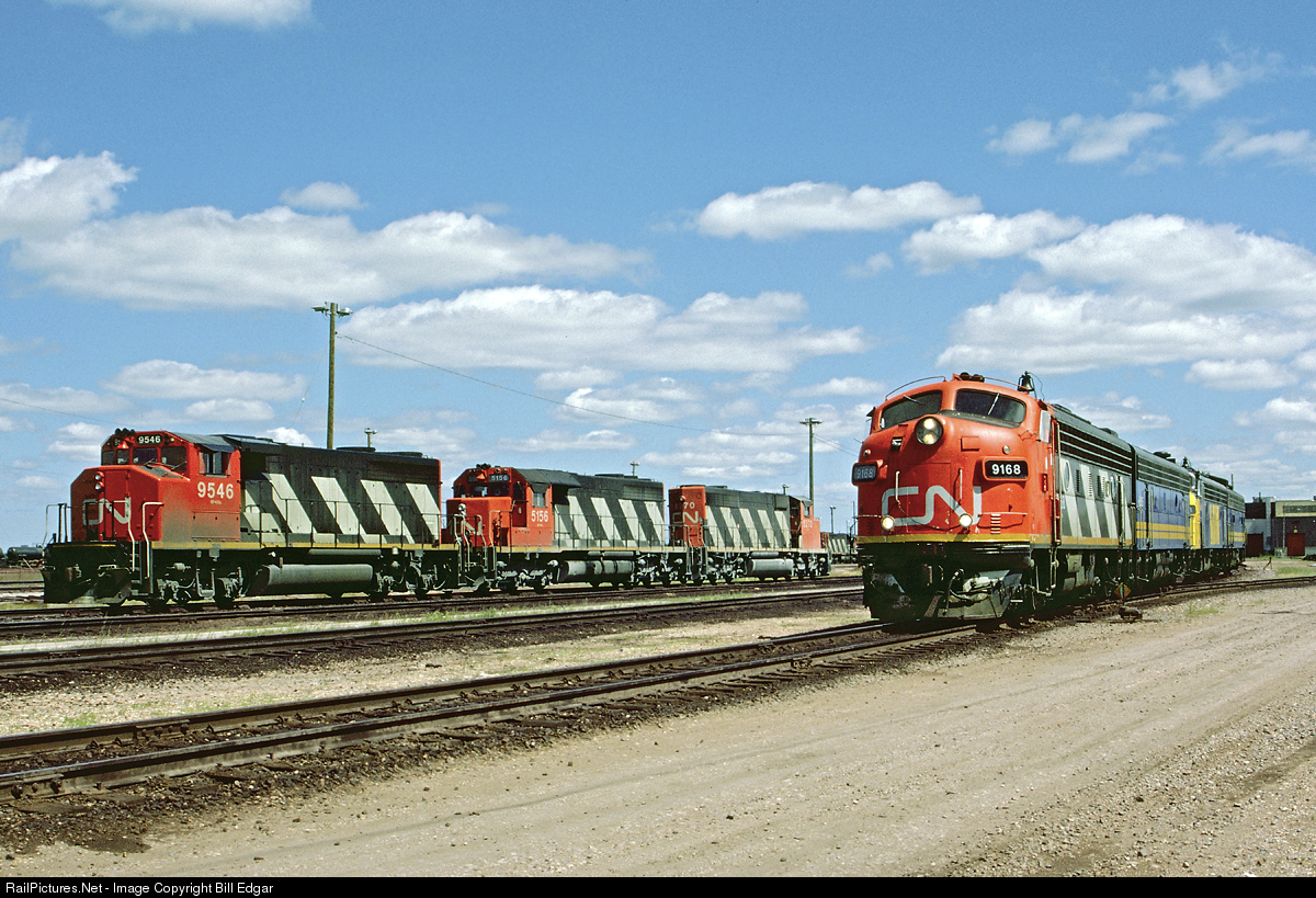 A herd of zebras was spotted out on the prairies of Manitoba in June 1986 as CN inadvertently lined up a nice sampling of GMD power at Symington Yard on Winnipeg's east side. The prize was F7A 9168 which had come into town earlier that day from the West on the point of VIA's Super Continental. Hostlers were making a move with it and attached VIA Fs including no. 6311, an FP9A. Meantime, a GP40-2W, SD40 and SD40-2W lined up to the left showing off CN's response to Action Red.