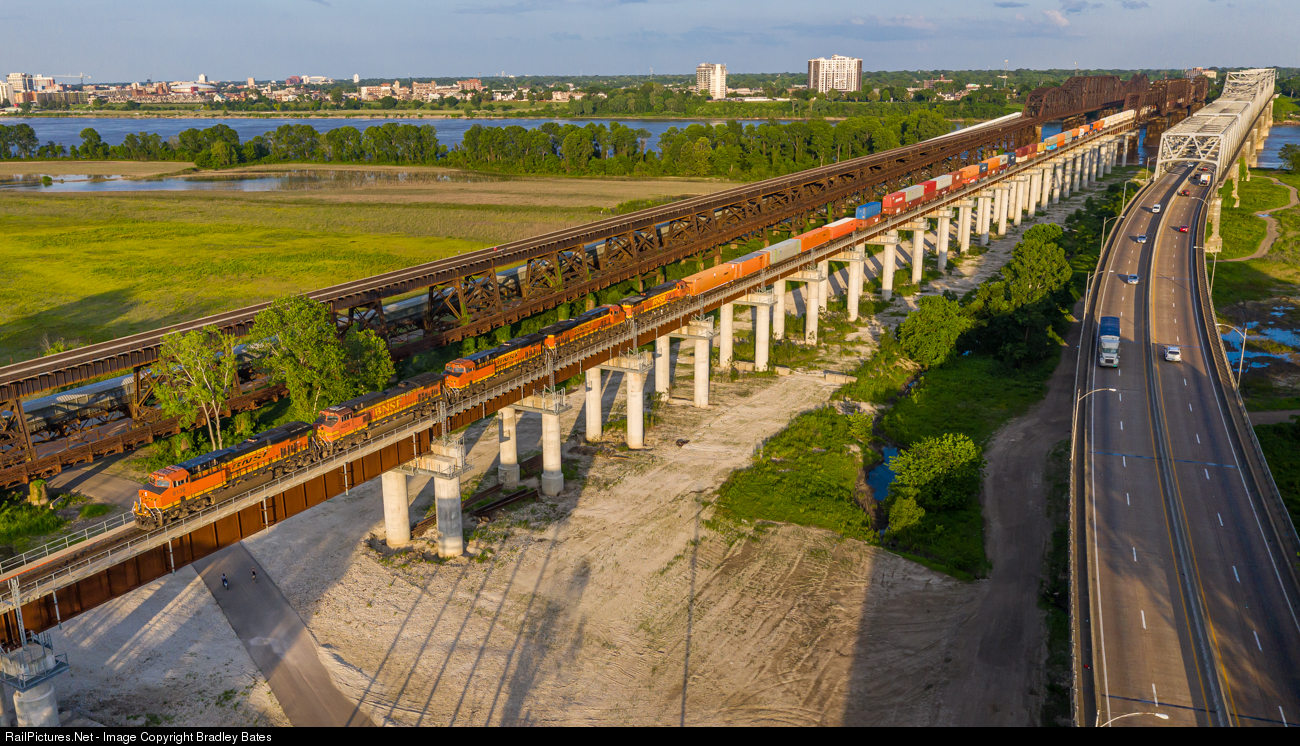 | A BNSF Westbound Intermodal Train crosses over the Mississippi River Bridge as they head across the Tennessee/Arkansas State Line out of Memphis, TN. |