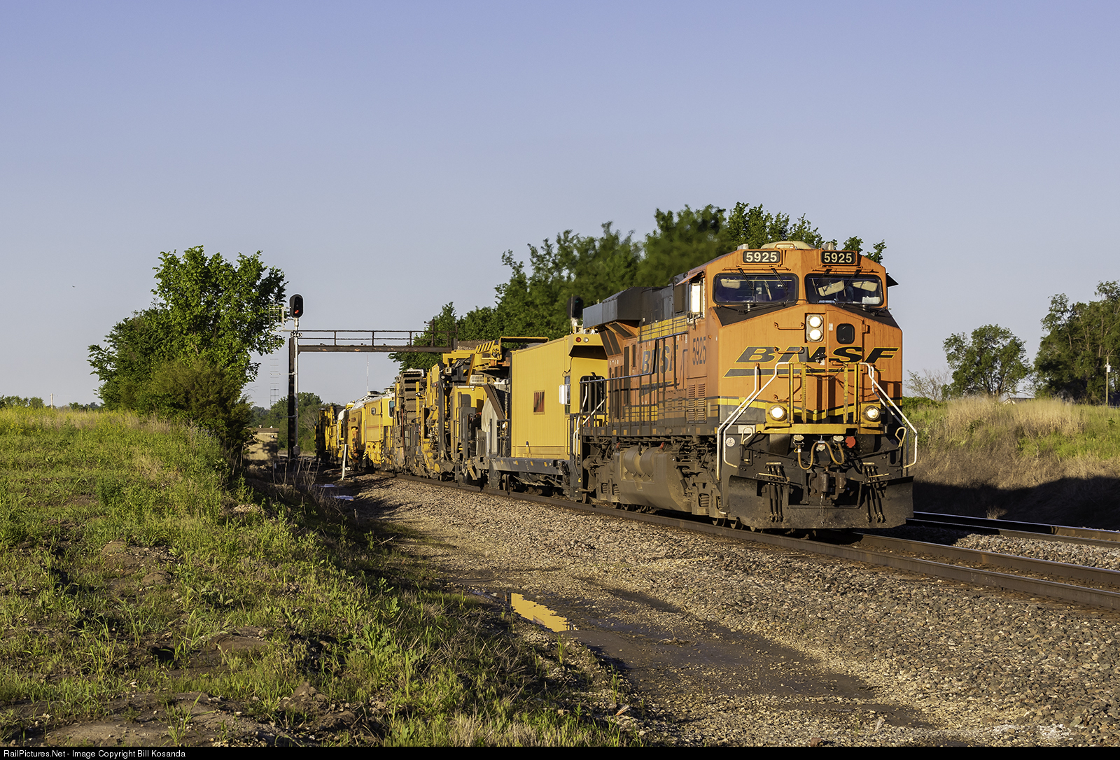 A Loram ballast cleaning train passes under the decommissioned ATSF signal bridge at Lisbon Road, north of Marceline, Missouri. You can see the signal bridge still in place, but the signal heads have been removed and new masts put in place. The bridge will soon be gone...