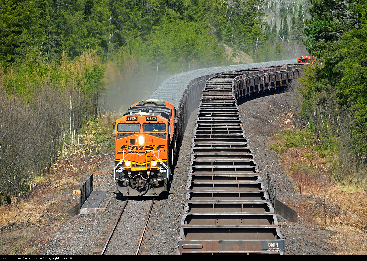 | A CN crude ore train using two BNSF horsepower payback units pulls 118 cars south towards the Fairlane plant and meets it's empty counterpart with two CN Dash 8's heading back to the mine at the half way point on the CN Missabe Sub.