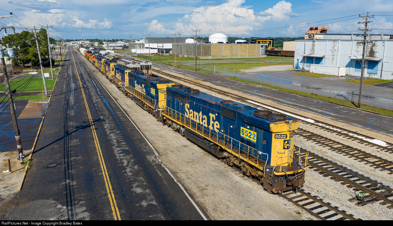 Two former ATSF SD45-2B's #6522 & #6523 along with three SD45-2’s #5701, #5703 & #5704, a BNSF Locomotive in the H1 paint scheme and a couple of H3 painted Locomotives all seen here sitting on Presidents Island in Memphis, TN, waiting to be moved to Progress Rail for scrapping