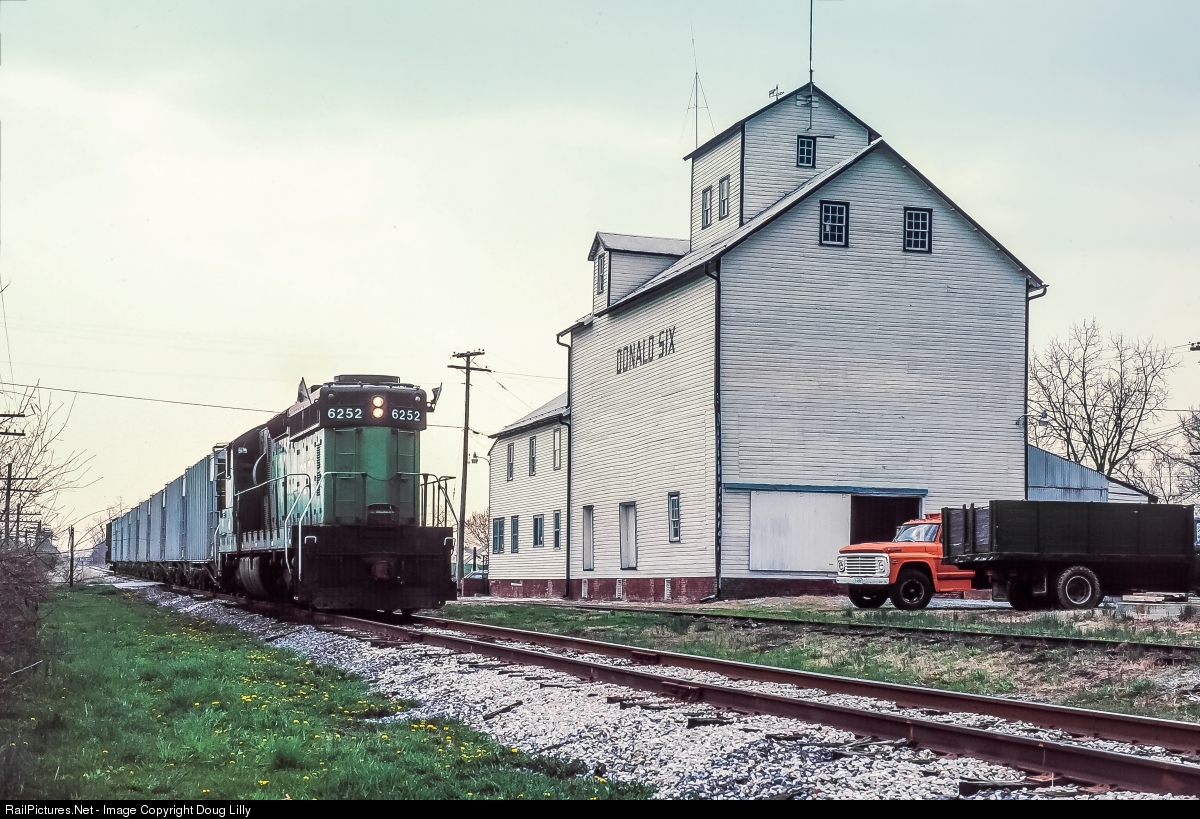 | A westbound Maryland Midland train, with a former Burlington Northern SD24 for power, passes the Donald Six mill in Middleburg, Maryland. |