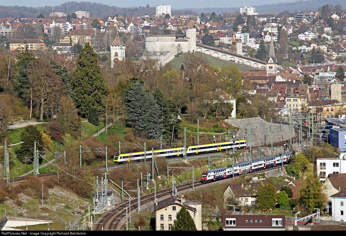 | On the upper line (German railway) two VT 612 are on the way from Singen to Waldshut. Down on the line of the Swiss federal railways a Siemens double decker RABe 514 is running in a S24 service Thayngen - Zug. |