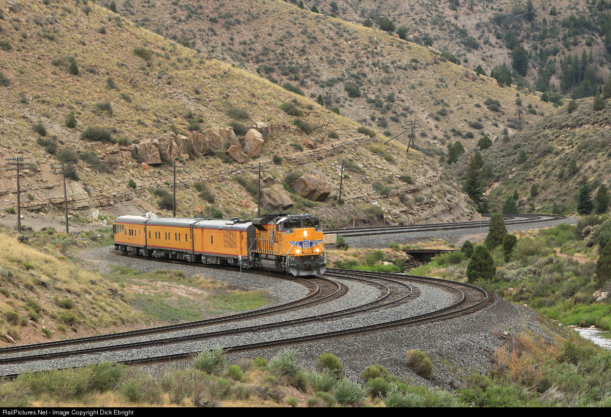 | This 3 car Union Pacific inspection train is swinging through the S curves at the upper end of the 2.4% grade in the Price River Canyon, Utah. The train was expected earlier in the day, but by the time it showed up it was overcast and near sunset. Nevertheless, I got this shot and another at Summit and a final one at Gilluly. |