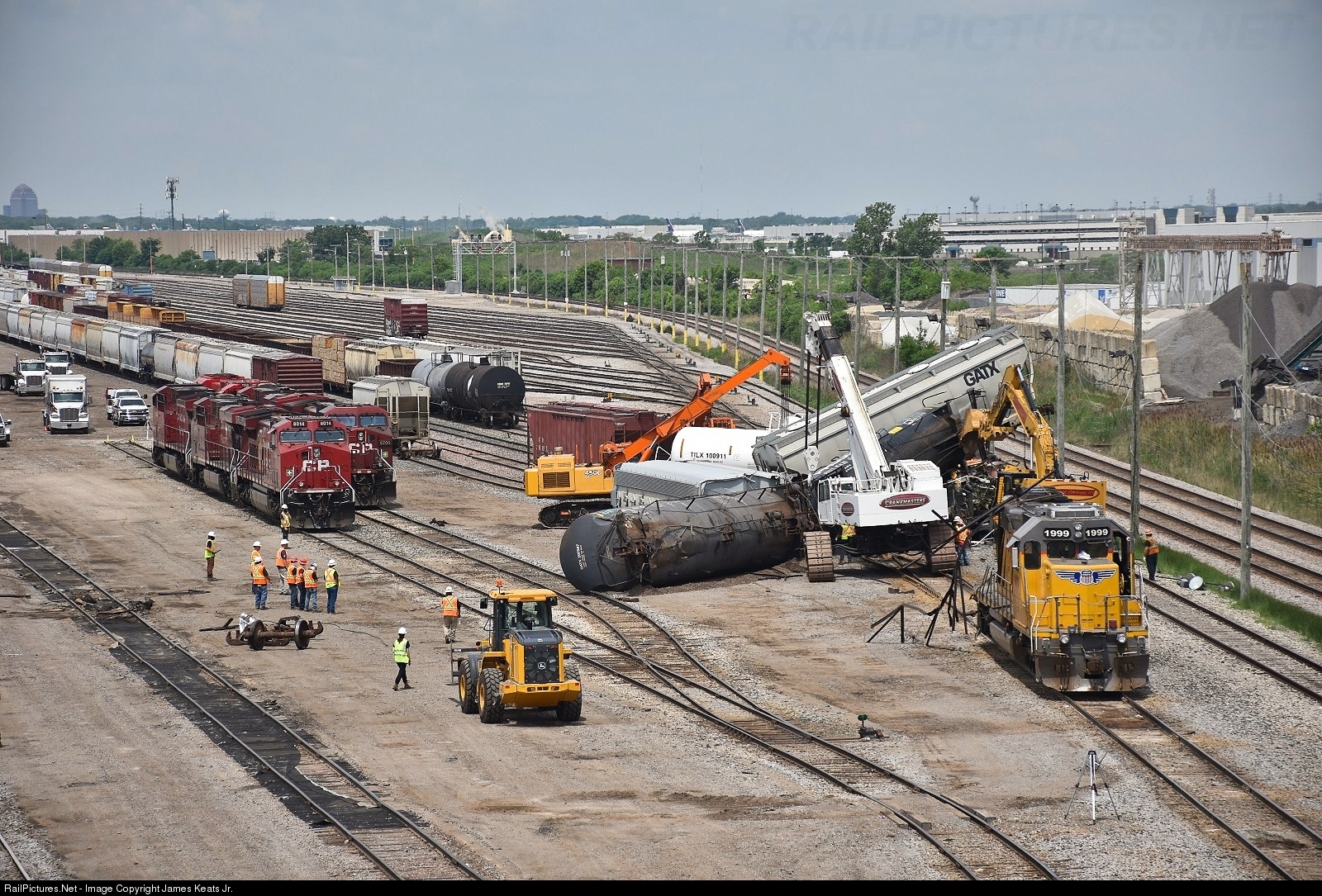 After an incident with a RC move, CP G41 sits in Bensenville yard with 7 derailed cars, a totaled UP SD40, and many dozers cleaning up the mess...