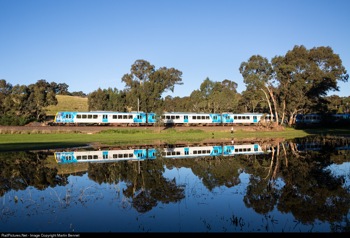 An X'trapolis suburban train runs through open countryside near Allendale Road, between Diamond Creek and Eltham stations on Melbourne's Hurstbridge line. This small lake only exists after extended periods of heavy rain. You can watch some video from this location here: https://youtu.be/6u7Mcnnt4eM