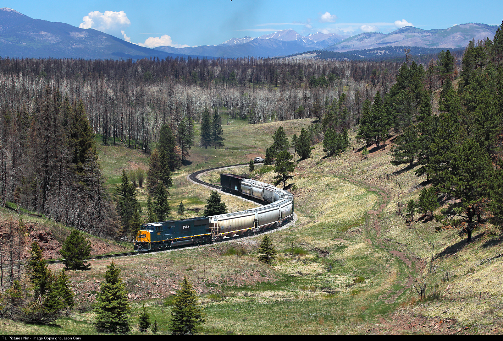 | La Veta Pass meaning Mineral Vein Pass lies at 9242 feet at the the top of the Sangre de Cristo mountains. This eastbound train is climbing the 2.5% grade approaching the famous "loop" at Fir. The San Luis & Rio Grande Railroad is the current operator of D&RGWs original route over the Rockies. SLRG is currently in bankruptcy proceedings creating many problems for the men trying to still move freight over the Pass. Currently the railroad is down to just two locomotives with only one SD70 reliable enough to lift freight over the grades. With the SD70m only able to lift about 10-12 loads at a time over La Veta tripling and even quadrupling cars out of Sierra is not un-common. A recent addition to operations over the route is hi-railer that checks for broken rails before and after nearly every train movement. |