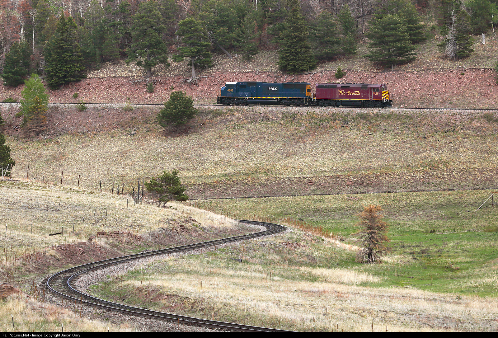 La Veta Pass With the PRLX SD70M having had mechanical issues the day before, the F40 that does not usually see service on the hill comes along just incase issues happen again. The power is moving west to pick up "hot" cars for Monte Vista that were set-out by a earlier train at the Summit. The track up the middle of the photo (and horseshoe) is the 7% balloon track that was used to turn steam helpers that shoved trains both eastbound and westbound up La Veta Pass.