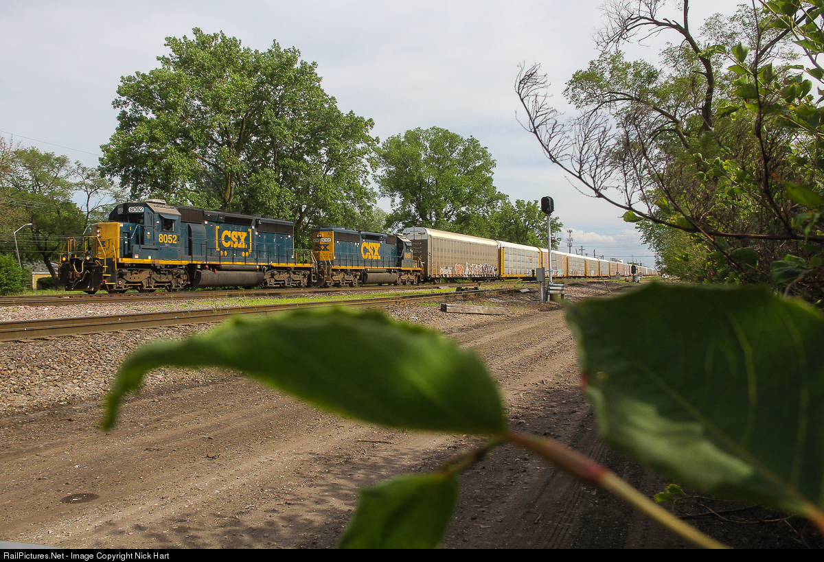 Q642-04 (Avon, IN - Chicago, IL Barr Yard) slowly rolls north through Dolton on the UP Villa Grove Subdivision, with a pair of 1979, ex-Seaboard Coast Line SD40-2 products. With 144 cars and just under 13,000 feet, the train is preparing to make a right hand turn at Dolton Junction for a quick eastbound run to IHB's Gibson Yard to drop off 120 autoracks. Normally routed down the Monon, the Q642 took to former MoPac rails today, where old signals still stand at this location. After yarding the train at Gibson, the pair of SD40-2's ran light to Barr Yard.