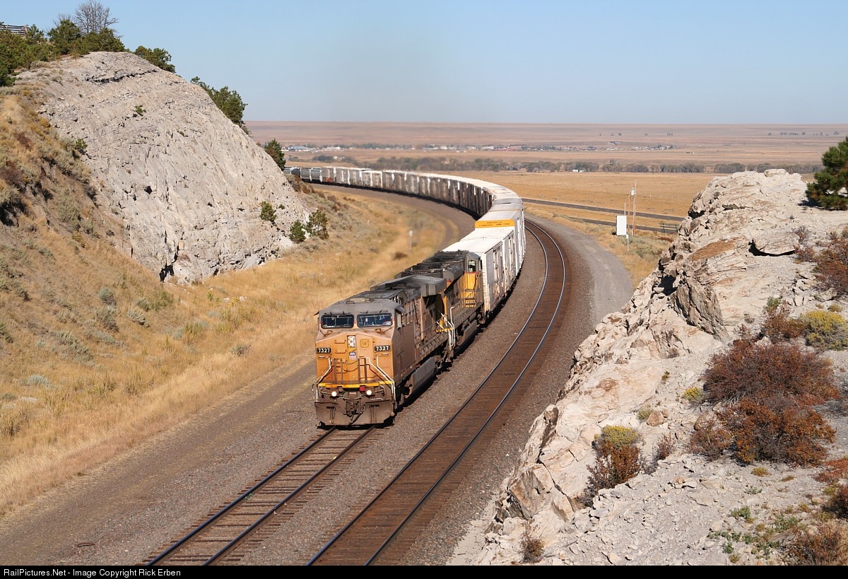 Beyond the town of Rock River, in the distance, one can see eastbounds approaching from about 9 miles out toward Wilcox from this cut in the Wyoming hills near the old station of Harper. The 7327 is leading an eastbound manifest up the grade out of the Rock River valley towards Lookout on a September morning.